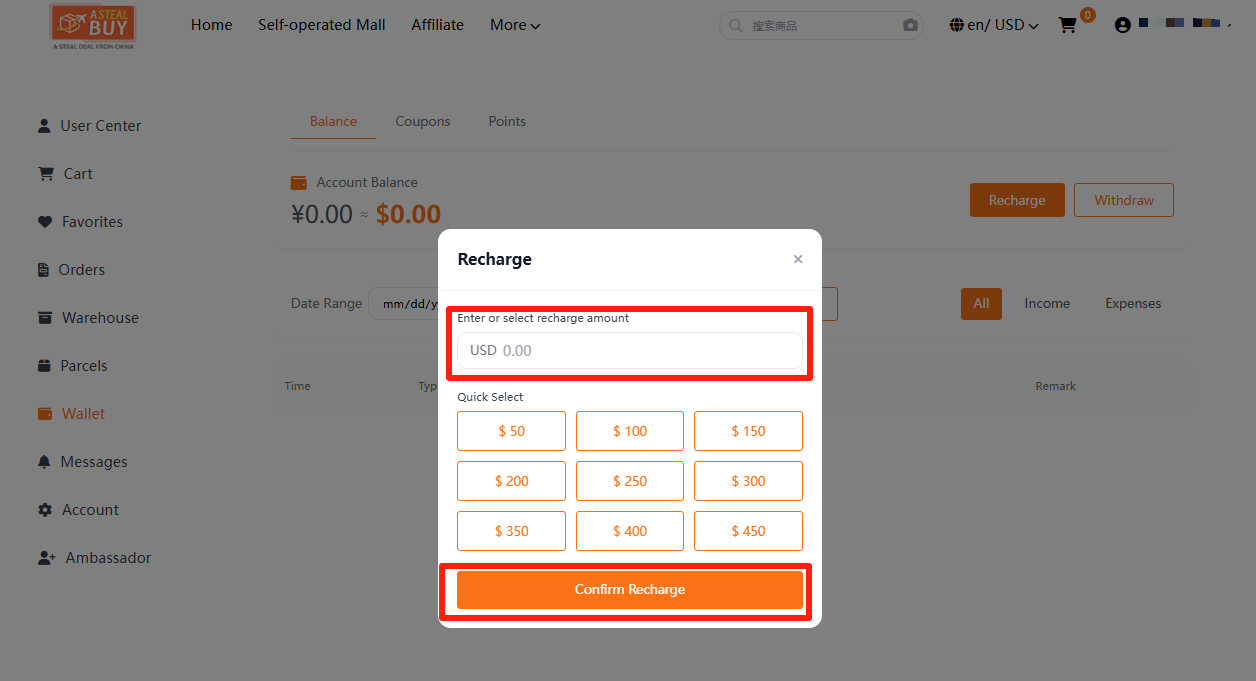 2. Enter the top-up amount and click [ Confirm Recharge ].