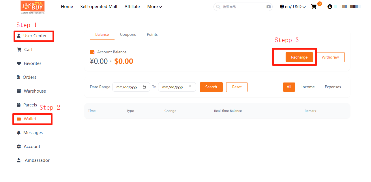 1. Login to your account, go to [ Wallet ] and click [ Recharge ].
