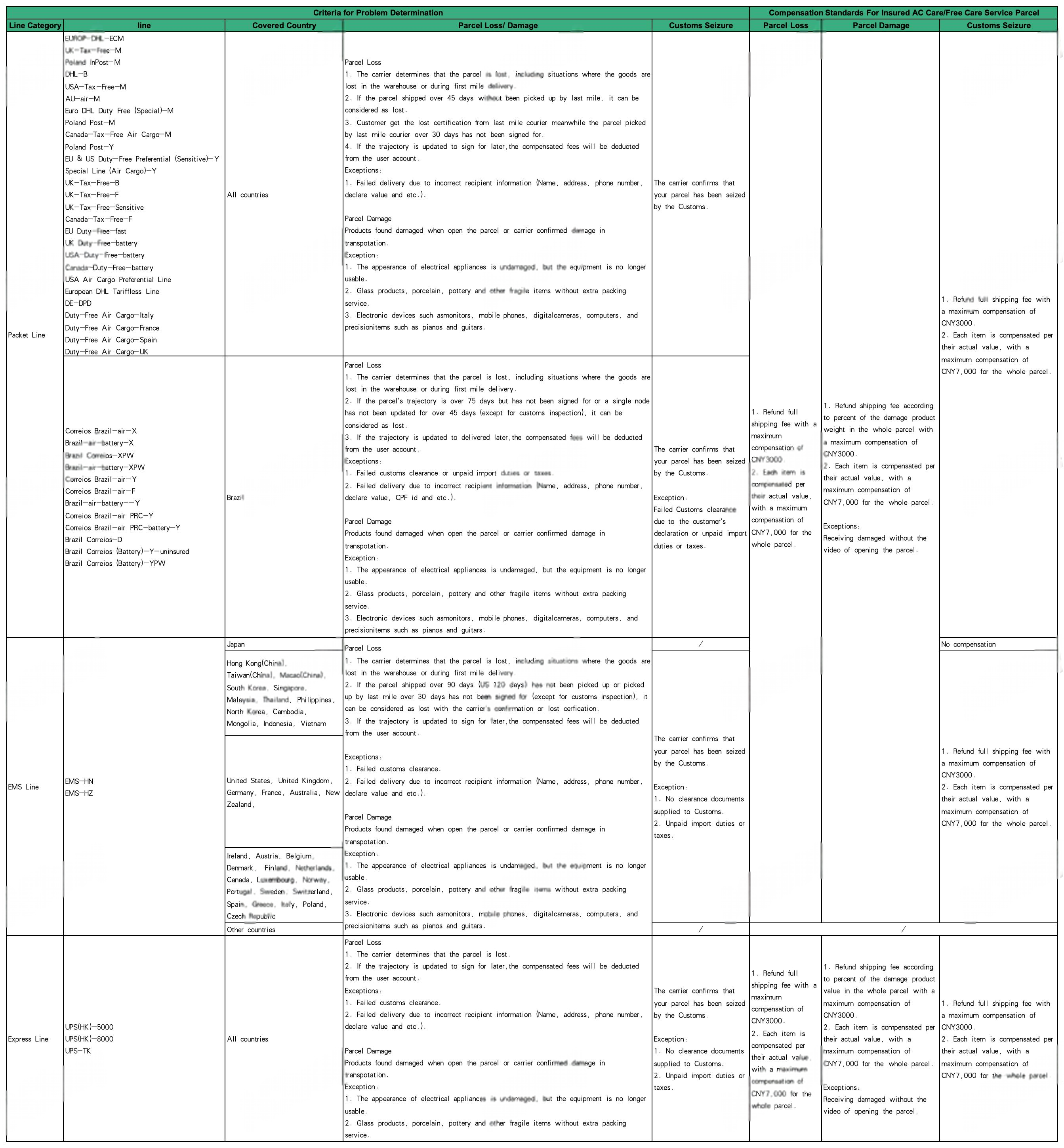 Compensation Standards for Insured Astealbuy Care & Free Care Service Parcels