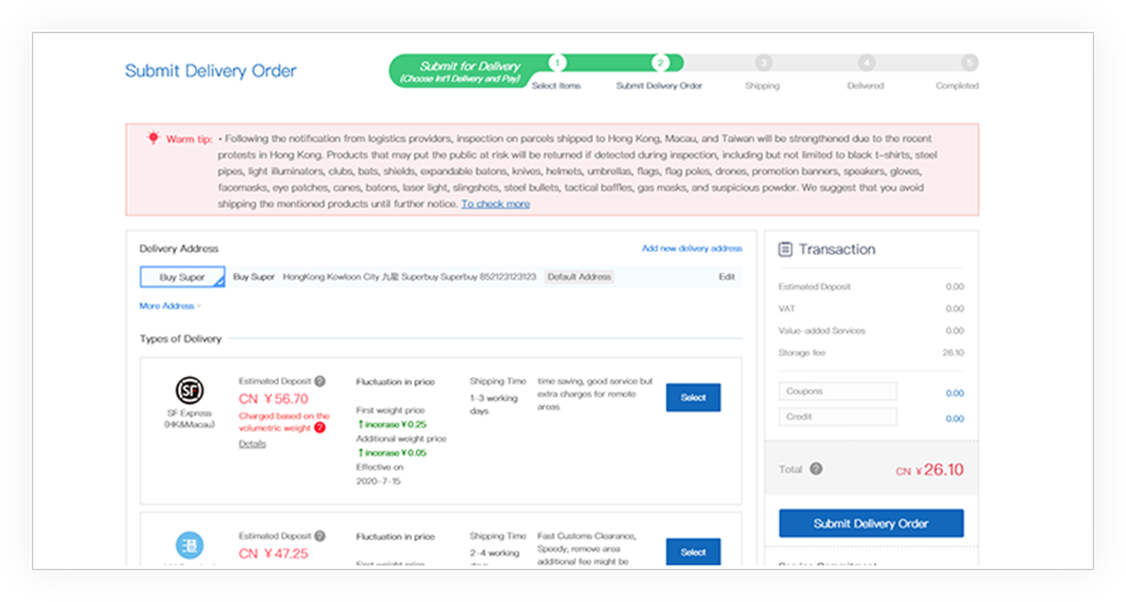 Once you have received the parcel, you can confirm the delivery via‘My Account’– ‘Parcels’. If you have any question regarding to the parcel, you can also choose the relevant parcel and apply for after-sales service.